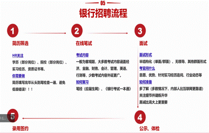 邴艺老师的讲座主要分为五部分:银行业务类型介绍、银行组织架构介绍、银行招聘岗位说明、职业发展路径介绍和招聘流程介绍。在业务类型介绍中,邴艺老师以图表形式全面介绍了银行的资产、负债和中间业务;在介绍银行组织架构时,邴艺老师详细说明了总行、分行和支行的联系与区别;在介绍银行招聘岗位和职业发展路径时,通过举例,老师生动地说明了不同岗位的具体工作内容,并点明各岗位的发展趋势和可能性;在介绍招聘流程时,老师从面试官角度,从笔试和面试两方面对同学们应聘给出切实高效的建议,希望同学们在面试中不要泛泛而谈,应当突出自身优势,引起面试官兴趣。