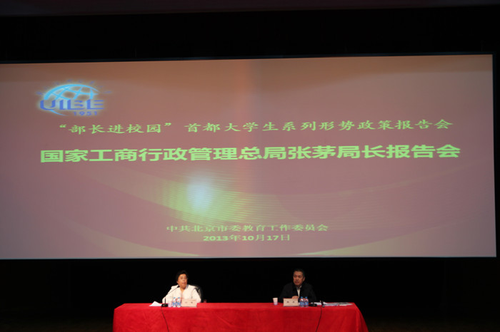 10月17日上午,best365足球官网50位员工代表参加了北京市委教育工委在对外经济贸易大学举办的“部长进校园”首都老员工系列形势政策报告会活动,听取了国家工商行政管理总局局长张茅题为“加强市场监管完善社会主义市场经济体制”的报告。