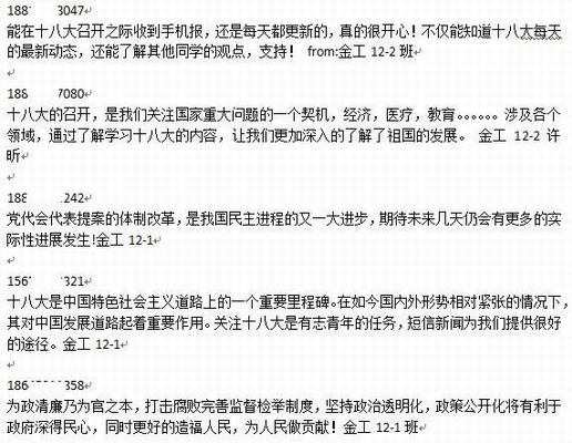 十八大手机报的形式也受到了同学们的一致好评。best365足球官网金融工程12-2班手机尾号为8047的同学发来短信说:“能在十八大召开之际收到手机报,还是每天都更新的,真的很开心!不仅能知道十八大每天的最新动态,还能了解其他同学的观点,支持!”文化与传媒公司新闻12级手机尾号为0647的同学发来短信,“这确实是很好的新闻报。利用同学们最常用的设备作为媒介,普及最重大最简明的信息,太有意义了。”