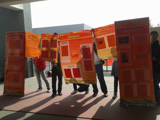 就在一旁,其他员工干部们也开始了十八大新闻墙的宣传活动。大家展开由同学们精心设计制作的易拉宝和海报,内容丰富、内涵深刻。“政策转播”、“群众之音”、“要闻播报”等多个板块从不同角度关注了十八大的进程发展。一张张海报凝聚着制作者的心血,一幅幅易拉宝是智慧的结晶,热情的中国红和温暖的黄色交织在一起,大气的构图配色吸引了众多同学的目光,大家纷纷停下脚步,仔细观看了海报、易拉宝的相关内容。“喜迎十八大,免费手机报活动开始啦,让你不出门便知天下事!”“喜迎十八大,再创新辉煌!”“聚焦十八大,展望新时代!”同学们响亮的口号声也持续地吸引着人群的注意力。