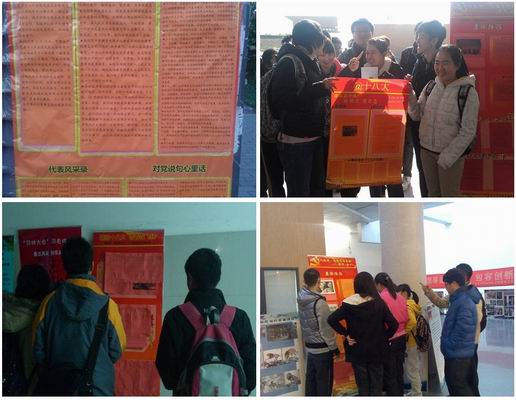 整个活动分成两部分,第一部分海报由团总支制作,张贴在食堂门口,每日更新。设计有“进程简介”板块、“中央精神”板块、“焦点关注”板块、“代表风采录”板块和“向党说句话”板块。“进程简介”板块主要介绍“十八大”的会议日程;“中央精神”板块用于公布该会议的决议和相关内容摘要,宣传“十八大”精神和中央指示;“焦点关注”板块用于展示人大代表商讨、热议的相关议题及其他引起社会广泛关注的热点问题;“代表风采录”板块用于展示人大代表的风采,可以自选每日所介绍的代表并可图文并茂;“向党说句话”板块是团员们发表个人观点、表达个人心声的舞台。第二部分海报由11、12级全体团支部,每两支部组成一个小组制作一张,张贴在主教大厅、老员工活动中心、宿舍楼下等位置。