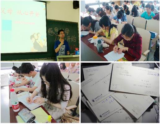 母亲节前夕,各班的主题班会相继揭开面纱。同学们放下各自手头的工作,聚到一起,静静地接受感恩教育的洗礼。伴随着精心准备的PPT,同学们陷入了一个用爱编织的世界。一个个感人至深的亲情故事、一段段温情涌动的感恩视频,用最真的情感打动了在场的每一个人。同学们在回忆中撷取那些爱的瞬间,分享着曾经的感动。在颤抖的声音里,在流动的光影中,感恩的心在渐渐苏醒。除了分享故事、欣赏视频,各班还围绕感恩这一主题准备了各具特色的节目,国际货币班的心理测试、10级金工2班的诗朗诵、11级金融2班的大合唱……让同学们在有趣的互动游戏中,体会感恩精神,也为本次的主题班会增添了几道亮丽的色彩。主题班会的最后,是统一的写家书环节,这也是本次活动一大亮点。同学们纷纷在信纸上写下对父母的感激之情,让积蓄已久的情感随着笔尖尽情流淌。虽然有便捷的通讯设备,但仿佛只有以这种最古老的方式,才能传达最质朴的情感。教室里,只听得见沙沙的写字声,一些同学写到动情处,甚至留下了眼泪。事后,很多同学都表示,这是他们人生中第一次给父母写信,觉得确实很有意义。还有同学建议“这样的活动应该更多一些,让同学们回归最本真的情感。”也有同学感叹道“以前跟父母的沟通实在是太少了,今后会试着多陪陪父母,多跟他们聊聊天”。