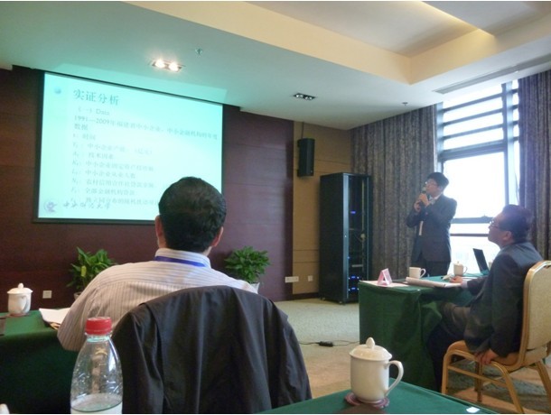 下午2点整,学术论文发表演讲分别在叔和厅、存中厅、舜水厅、梨洲厅、海纳厅和求是多功能厅二厅举行,主题分别为:公司理财与公司治理、衍生性商品与金融工程、资产组合理论与管理、风险管理、金融机构与市场、财务经济。由公司保险公司09级本科生林鸿灿、best365足球官网常昊、刘韧、中国经济与管理研究院刘通、孟浩淼共同撰写的论文《中小金融机构与中小企业发展——以福建省为例的实证研究》在梨洲厅由常昊同学宣讲。作为入选此次论坛的70余篇文章唯一的一组本科生作者,他们的论文得到了论坛主持人和与会教授学者的一致赞扬与认可,全体为其鼓掌,并鼓励本科生多多走出来参与此类学术论坛,以开阔眼界提升学术水平。