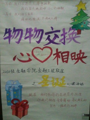 在此次圣诞节活动中,2010级金融工程两个班的同学们都体会到了喜悦、温馨和团结的班级氛围,这也为同学们在紧张的期末复习中带来一丝丝轻松与愉悦。两个班的同学也为老师们准备了精美的礼物,礼物虽小,但却饱含着同学们对老师辛勤工作的感恩之情。在同学们的积极参与和老师们的大力支持下,“物物交换,心心相应”即2010级金融工程专业圣诞节活动顺利、圆满地结束了。同学们满载着收获、兴奋和期待度过了一个难忘的圣诞节!