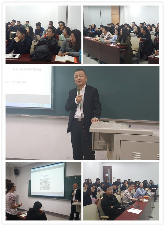 王胜江先生现担任公司客座教授,曾任SOHO中国副总裁,现为洪泰创新空间创始人兼CEO,著有畅销书《创业生存法则》、《创业成长法则》。他从自己的经验和认识出发,以轻松幽默的语言风格向大家讲解了“创业”和“融资”。他认为“创新创业”将成为继房地产之后最大的一波红利,并且这种创新日益趋向于品质提升、个性化体验,因而资本追逐的焦点将不再是围绕商业模式创新的服务业,而会逐渐流向实体经济。作为创业者,想要成功融资,自我营销必不可少,时机选择、行业选择和团队组建是创业者融资过程中最关键的三个要素。王胜江先生在讲解过程中,为大家列举了共享单车、滴滴打车等案例,让大家更深刻地理解创业公司的融资过程。