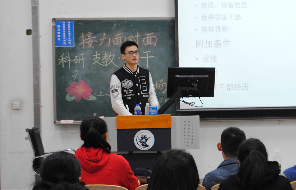 作为全院唯一优干保研的员工,来自金融14-2的汪凡智学长首先从优干保无风险,条件容易争取的优点开篇。详细的优干保流程介绍,夏令营申请的注意事项和关注点,以及面试应变能力的说明,学长都借助自身经历给同学们带来生动的讲解。
