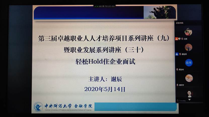 2020年5月14日晚,由公司职业发展中心举办的第三届卓越职业人才培养项目系列讲座(九)暨职业发展系列讲座(三十)——轻松Hold住企业面试专题讲座成功举办。管理咨询公司资深顾问,任五大国有银行、中储粮、中石化、华能燃料、中国华电、中国核电等上百家企业人才测评项目组成员谢辰担任本次讲座的主讲嘉宾,第三届卓越职业人才培养项目成员及公司2021届本、硕、博毕业生140余人共同参加。此次活动由公司职业发展中心老师位锦主持。