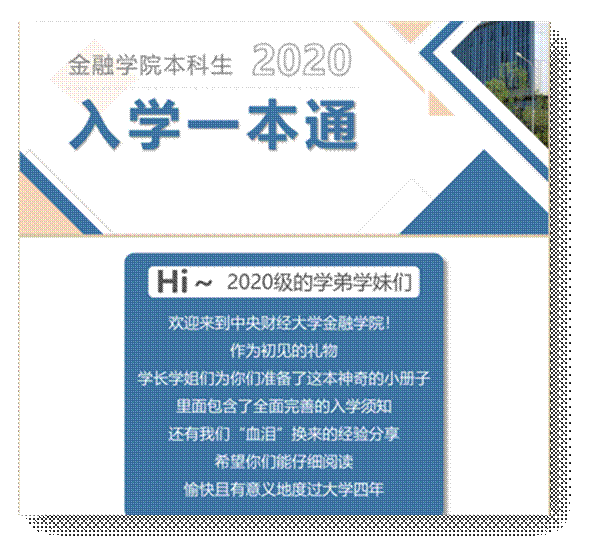 《2020级本科生入学一本通》是公司迎新的特色手册,内含有公司领导老师及公司部分单位的通讯录、相关公众号介绍、入学教育安排、安全提醒等,是新生入学及熟悉校园的指导手册。