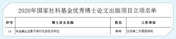 日前,全国哲学社会科学工作办公室公布了2020年国家社科基金后期资助暨优秀博士论文出版项目立项名单,其中国家社科基金优秀博士论文出版项目67项,公司2019届博士毕业生韩珣的博士学位论文《非金融企业影子银行化的经济效应》获批立项资助。