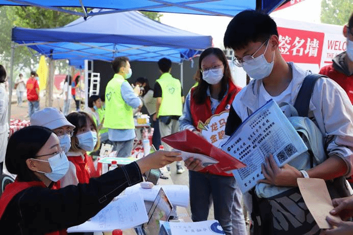 作为中财大院,金院的报道点也有许多亮点:象征着金彩金院的白金金属气球装饰着迎新棚,志愿者可以手持的青春标语KT板,新生可以寄语留念的祝福墙,以及带有公司标识的合照板,处处精心的布置彰显了公司对新生的美好期许。