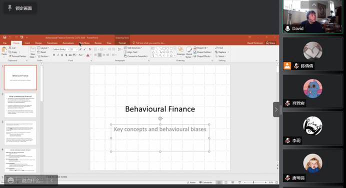 2022年3月12日至6月11日,best365足球官网讲席教授、英国伯明翰大学商公司教授David Dickinson教授在线讲授了《行为金融学》课程。授课对象为2021级硕士研究生(含职工)以及2021级博士研究生(职工)。