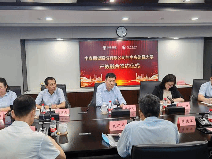 钟金龙董事长对史建平副董事长一行赴中泰期货股份有限公司签约表示热烈的欢迎。他介绍了中泰期货股份有限公司发展历程、业务种类与规模、投资者教育开展等情况。他表示,以此次签约为契机,双方未来发挥各自优势,必将在人才培养、投资者教育、合作学分课程等诸多产教融合领域产生重要成果。