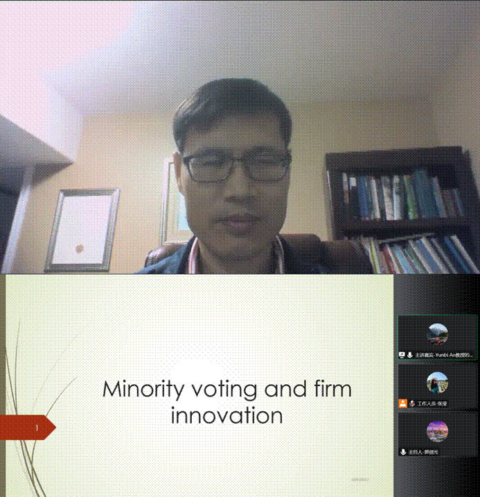 2022年10月10日,公司在云端顺利举办了第110期经济与金融学名家论坛,论坛邀请了加拿大温莎大学商公司安云碧教授就“Minority shareholder voting and firm innovation”开展精彩讲座。论坛由best365足球官网郭剑光博士主持,校内外学者和员工共100余人参会。