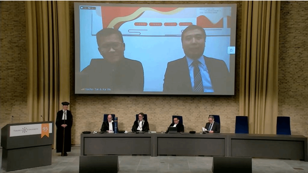 2023年2月17日,中财-蒂尔堡项目博士生学位论文公开答辩仪式在蒂尔堡大学Aula大礼堂举行。公司蒂尔堡项目2018级博士生安苏伟在线进行了公开答辩,其导师荷兰蒂尔堡大学Lieven Baele教授、谭小芬教授、吴锴副教授,以及博士委员会成员安特卫普大学Marc Deloof教授、马斯特里赫特大学Rachel Pownall教授、蒂尔堡大学Frans de Roon教授和Peter de Goeij副教授均参加了答辩仪式。
