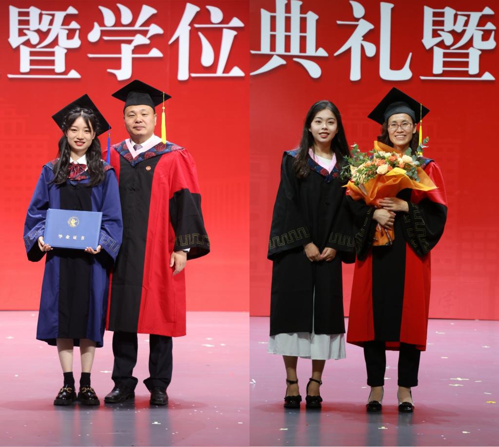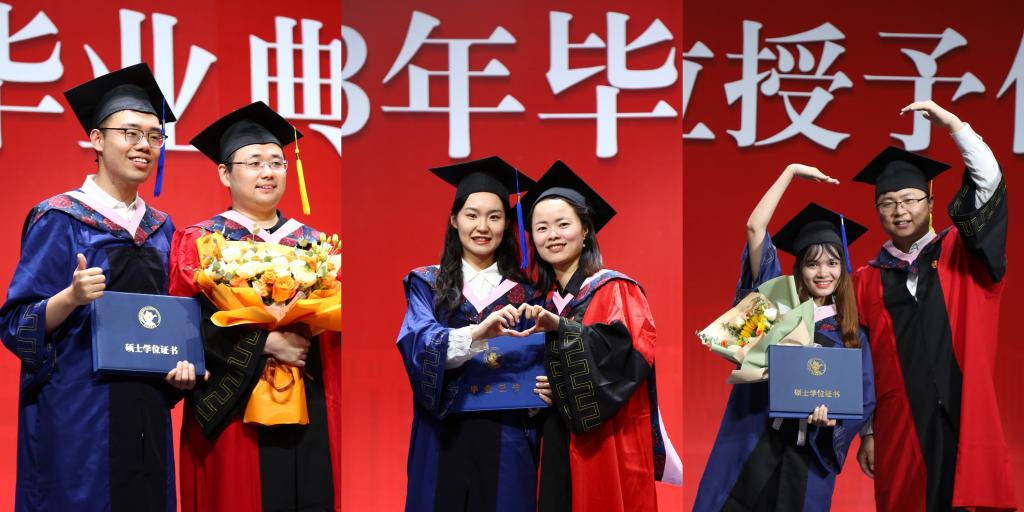 在紧随其后的2023年毕业生学位授予仪式上,张学勇经理、王辉书记、魏旭副经理、苟琴副经理、彭俞超副经理为往届及2023届毕业生颁发毕业证书和学位证书,扶正流苏并合影留念。