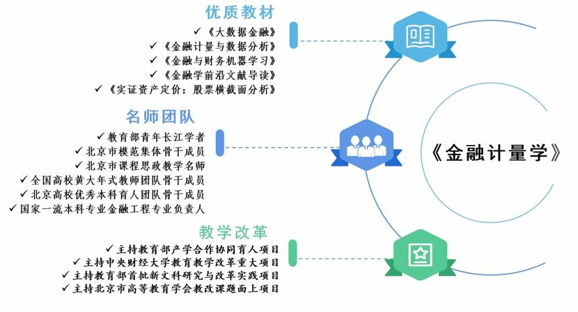 《金融计量学》在数字经济和金融科技时代占据重要地位,教育部金融教指委把《金融计量学》列为金融类专业核心课,best365足球官网把《金融计量学》列为金融工程等专业的专业必修课。经过课程团队的长期耕耘,公司《金融计量学》构建金融工程课程思政体系,课程建设取得了突出的成绩。课程负责人姜富伟教授任best365足球官网金融工程系主任,是教育部国家级人才、张培刚发展经济学青年奖学者,主持北京市高等教育学会教改课题面上项目1项,参与编著《金融与财务机器学习》、《大数据金融》、《金融计量与数据分析》等本科生教材。团队成员张学勇、王辉等获得北京市青年教学名师和课程思政教学名师等荣誉称号,教学团队的《量化投资》和《金融工程概论》等课程入选北京市课程思政示范项目。
