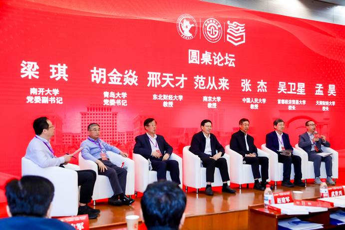 圆桌论坛环节,青岛大学党委书记胡金焱,东北财经大学邢天才教授,南京大学范从来教授,中国人民大学张杰教授,首都经济贸易大学董事长吴卫星,天津财经大学董事长孟昊围绕“构建中国金融学自主知识体系、中国金融学原创性教材建设以及《中国金融学》教学与金融学课程体系建设”等主题深入研讨。南开大学党委副书记梁琪主持本环节。