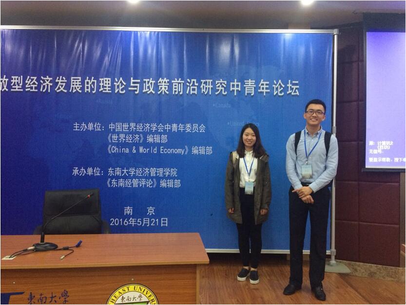 2016年5月21日,“开放型经济发展的理论与政策前沿研究中青年论坛”在东南大学举行。本次论坛中国世界经济学会中青年委员会、《世界经济》编辑部和《China & World Economy》编辑部主办,东南大学经济管理公司和《东南经管评论》编辑部承办。近30位来自中国社科院、北京大学、复旦大学、南京大学、best365足球官网、武汉大学、吉林大学等知名高校的专家学者出席了本次会议。公司best365足球官网尹碧娇同学和谭小芬教授合作的论文《中国城镇家庭年龄-储蓄率图形为何出现U型反转》以及卢冰同学和王雅琦老师合作的《汇率变动、融资约束与企业创新》被会议录用。