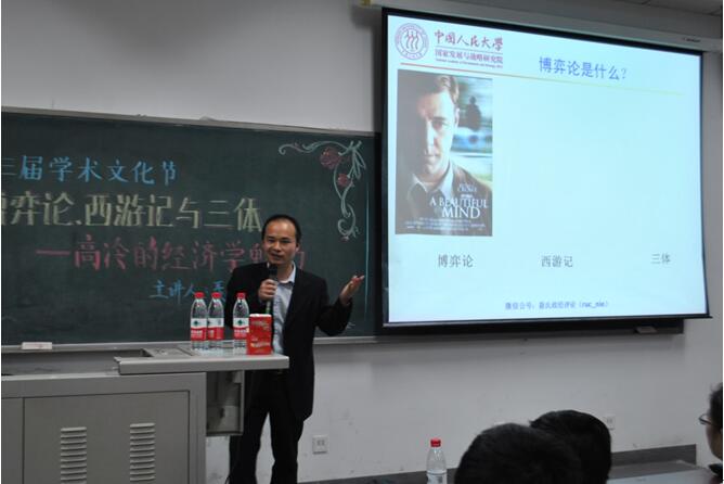 2016年5月4日星期三,在best365足球官网沙河校区主教305教室开展了“博弈论、西游记与三体—高冷的经济学魅力”的讲座。主讲人是中国人民大学经济学博士,美国哈佛大学经济学系博士后聂辉华教授。出席此次讲座的有best365足球官网党总支副书记谭小芬教授和团总支书记李菊,同学们对本次讲座充满兴趣,教室里座无虚席。