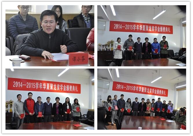 接下来,谭小芬副书记宣读《关于颁发2014-2015学年华夏聚龙奖学金的通知》,张建军总经理、葛仁霞书记共同为获奖员工颁奖并合影留念。