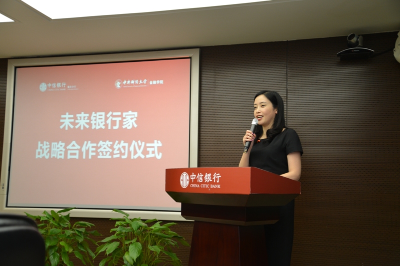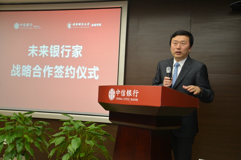 随后张礼卿经理在现场进行了激情的发言,对中信银行重庆分行领导层对本次战略合作的倡议提出和大力支持表示衷心的感谢。张经理指出,作为中信集团的重要成员,中信银行在整体扩张、业务创新和体制改革等方面都取得了卓越的成就,有着非常好的市场形象和地位;重庆分行作为中信银行西部发展的重镇和重庆本地金融界的重要力量,能与公司建立战略合作框架,感到非常荣幸。张经理也分析了当下中国经济的现状,表示在进入经济新常态,面临着很强的经济下行压力,金融风险也在不断上升,银行改革也在不断深化,这既是机遇也是挑战,对教学和银行运作都提出了新的课题。张经理介绍了公司是最早的金融人才培养基地,目前作为国家级的重点学科,有“人才培养、科学研究、社会服务”三大基本任务,开展产学研结合是主要的办学方针。从去年开始,公司已经与中信银行重庆分行开始了校园招聘、高管培训和“新金融实验室”等方面的合作;今天签署战略合作协议,将是一个新的起点,并对未来的合作充满信心。“未来银行家”教学实践基地的建立对公司来说很有意义,可以让参与其中的员工受益匪浅,同时也可以方便银行近距离地考察年轻人。