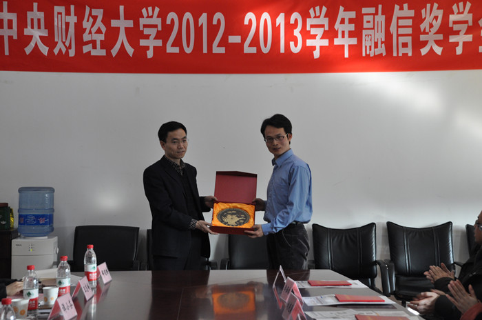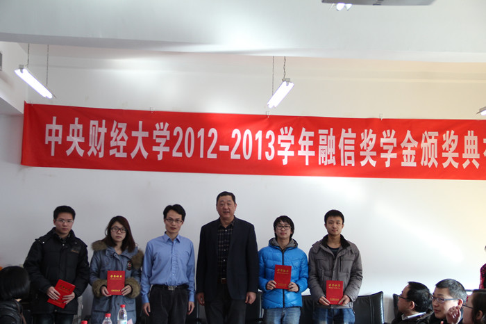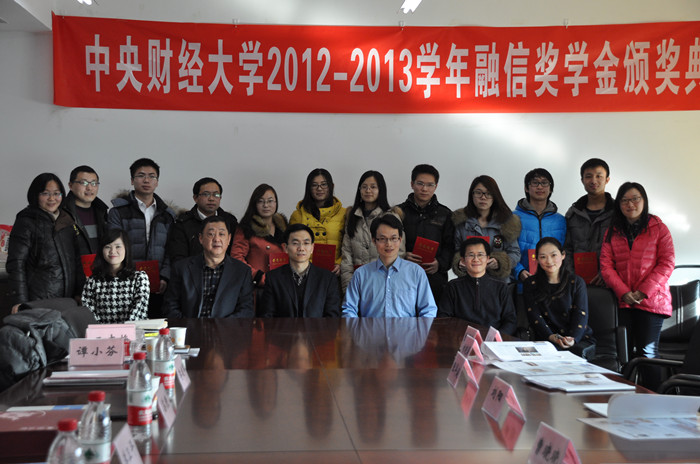 在颁奖环节,best365足球官网副经理李建军老师宣读《关于颁发2012-2013学年融信奖学金的通知》,融通汇信投资咨询有限公司苏焘副总裁和李卫平总监共同为获奖同学颁发证书,与获奖同学合影留念。