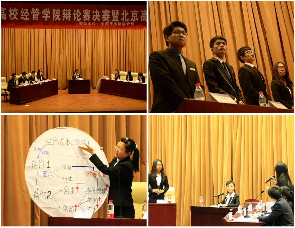 之后,第十届首都高校经管公司辩论赛决赛正式开始,辩论主题紧紧围绕当前国计民生的热点问题 “货币超发是不是房价大涨的主要原因”。正方中国传媒大学经济与管理公司持观点“货币超发是房价大涨的主要原因”,其一辩清晰流畅的开篇立论博得了观众的热烈掌声;而反方也毫不示弱,一辩用一幅示意图向全场观众展示了房价大涨的缘由,别出心裁。随后比赛变得更加激烈,双方辩手唇枪舌战,你来我往。正方从货币超发引起投资需求增加、土地价格上升导致房价大涨的角度系统地对命题进行了论证,同时引出多个专业模型和实例作证,可谓准备充分,论据充实。反方也表现出色,不仅对对手“主要原因即影响最广泛深远的原因”的观点提出质疑,对其过于片面的看法进行驳斥,还用ADF模型、经济机制中环环相扣对房价促涨的影响等观点成功捍卫了自己的观点。