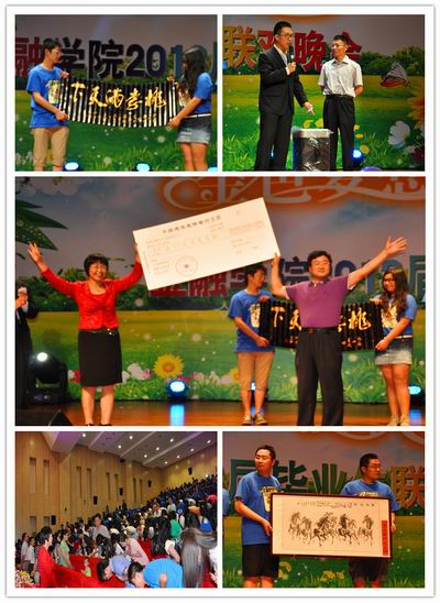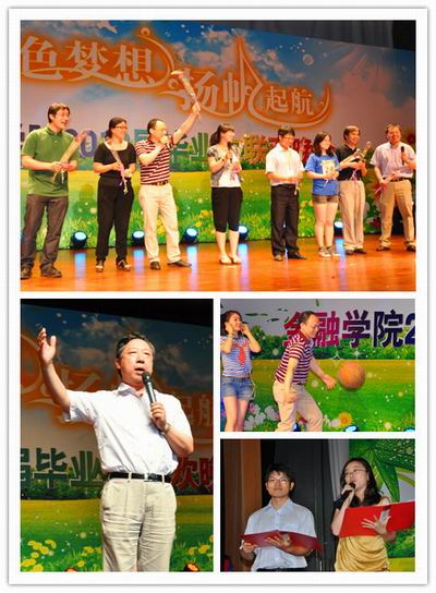 教师员工广泛参与,场内场外深度互动。张礼卿经理高歌一曲《滚滚长江东逝水》祝愿同学们在前进的道路上取得成就与辉煌;葛仁霞书记深情寄语同学们,“感恩是一种人生哲学,是生活中的大智慧、是一种品德,感恩是学会做人的支点,希望同学们常怀感恩之心,去创造多彩、美丽、幸福人生”;并与同学分享“工作与生活并重,理想与勤奋同行”。李德峰副书记一句“我永远爱你们,祝你们事业有成,生活幸福”的祝福永远铭记在场同学的心中;毕业班辅导员、班主任带来的视频配音《毕业 毕业》模仿得惟妙惟肖,将晚会推向了高潮;2010级金融工程研究生班班主任郭剑光老师应邀为大家带来一段篮球秀;研究生工作办公室罗卓笔和迟香婷老师也通过诗朗诵道出了对同学们的浓浓情意;史建平副董事长、李健老师、张碧琼老师等十余位老师通过微电影《中财情》,世界各地工作、求学的十余位员工代表虽不能亲临现场却也以视频《员工祝福》、人人墙等形式表达了对毕业生的祝福和希冀。