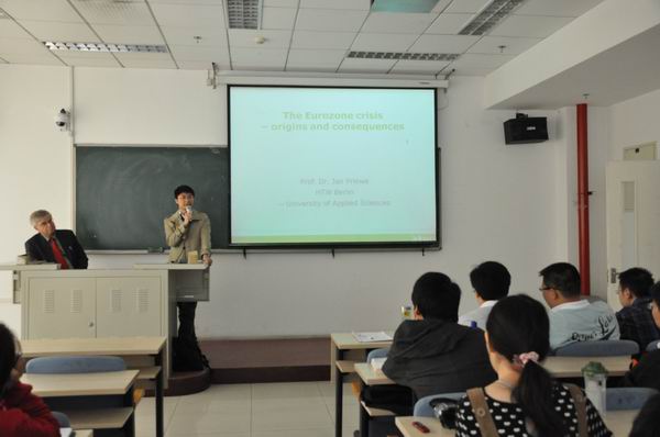 2012年10月16日,德国柏林应用科技大学国民经济学教授——Jan Priewe在中财大厦二层通用教室四为我们带来了系列讲座的第二讲,题目为“欧债危机的成因和前景”。best365足球官网经理助理黄志刚博士主持了讲座。