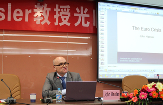 晚七点整,讲座准时开始。本次讲座的第一部分是关于欧洲债务危机最新进展的相关内容。John Hassler教授首先简要介绍了欧洲货币联盟的一些现状。接着,他重点分析了对于本次欧债危机的五种解释,即主权债务危机论(主张由危机国自主解决问题)、竞争力差距论、银行业危机论、欧元区危机论及政策治理危机论。John Hassler教授认为,欧债危机发生的根本原因还是要追溯到欧洲货币联盟自身的体系结构缺陷。随后,Hassler教授还简要介绍了欧盟针对欧债危机所采取的相关政策以及欧洲中央银行所实施的一些非传统性措施。然而措施只能给这些国家带来短暂的喘息,2012年的秋天,欧元区的前景仍不明朗,旧体制内的改革受限,无法解决关键的问题,教授认为欧元区正在面临“前进或是倒退”的选择,而由于一系列的历史现实原因,欧元区解散的可能性很小,但是希腊退出欧元区的担忧正进一步加剧。