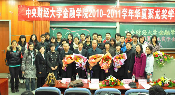 听完嘉宾和老师们温暖的讲话,活动进入了激动人心的颁奖环节。 27 位获得奖学金的同学按照一、二、三等奖依次上台领奖, 北京 华夏聚龙自动化股份公司的领导和公司领导为获奖员工颁发了获奖证书并合影留念。随后, 2008 级金融学一班“优干保研”的罗丹同学代表全体获奖员工发言,感恩是她发言的主题。“是公司、老师、社会各界的关怀让我能够放心去飞。”罗丹同学激动地说。她向在场的所有人作出了郑重的承诺,她必定会更加发奋努力,用优异的成绩回报社会。