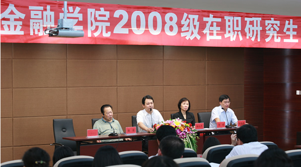 9 月 21 日 上午,公司 2008 级金融学在职研究生开学典礼在中财大厦二层报告厅隆重举行。研究生部副主任杨运杰教授、best365足球官网党总支书记贺培教授、教师代表姚遂教授出席了开学典礼,开学典礼由best365足球官网副经理张晓涛副教授主持, 118 名新生参加了开学典礼。开学典礼结束后, 郭田勇教授为 2007 级和 2008 级共200余名在职研究生作了题为“当前宏观经济形势与金融调控”的学术报告。