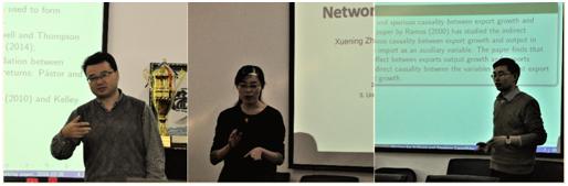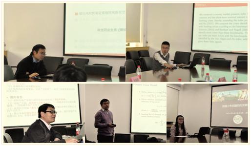 廉永辉老师介绍了银行同业业务的风险传染效应,采用最大熵方法以网络联系强度为权重计算了各银行的同业业务对手的总风险,并且总结了容易受到风险传染的银行的特点。荆中博老师基于中央银行储备和短期名义利率建立了货币市场压力指数,以识别银行的系统性风险。同时荆中博老师扩展了Von Hagen和Ho提出的指数,从而可以更精准地识别危机。方意老师创新性构建了包含银行破产机制和去杠杆机制的资产负债表直接关联网络模型,发现在传染渠道中去杠杆渠道和银行间负债违约渠道最为重要。方意老师认为,在传染过程中,银行破产会导致系统性风险急剧上升,且破产越集中,系统性风险越大。同时提出,系统性风险存在“区制转换”效应。陈锐老师围绕股利增长的可预测性,向我们介绍了他的观点。他认为,将股利增长的可预测加入考虑范围之后,与折现率相比,现金流信息对驱动股票价格变化具有更重要的影响。涂晓枫博士基于信息溢出的视角,构建了一个我国上市金融机构之间的关联网络,并在网络分析法的基础上,解读了金融网络的总体关联性以及部门内和部门间的关联特征。最后发现金融机构影子业务规模的快速扩张是我国金融机构关联水平上升的重要因素。在讨论提问环节中,廉永辉老师与涂晓枫博士对演讲中所介绍的模型是否存在协整效应进行了讨论。