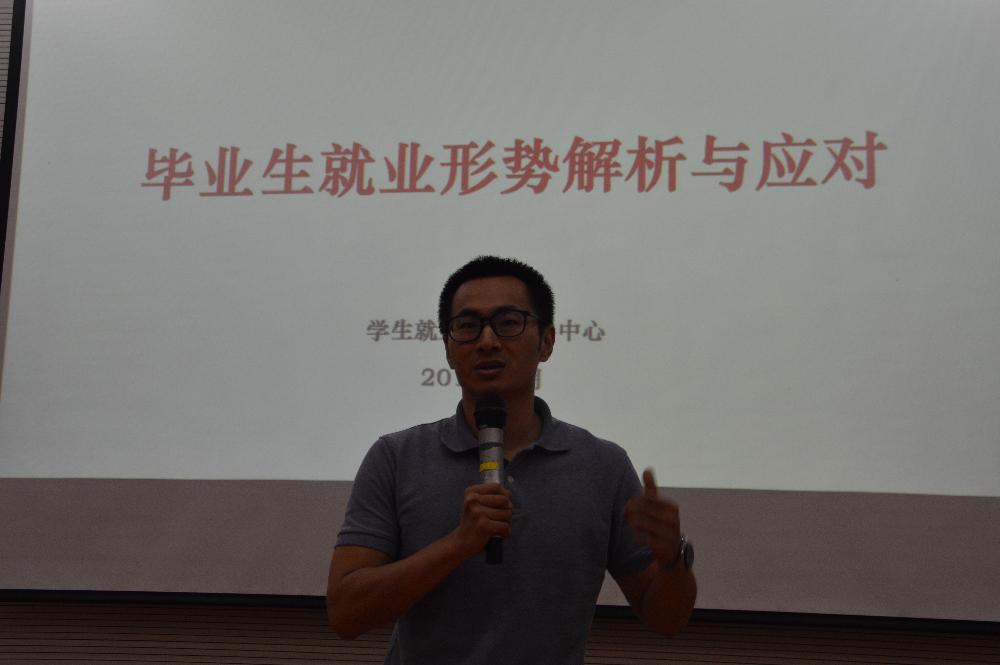 随后,员工就业创业指导中心就业创业信息管理与服务办公室副主任邸飞从公司层面介绍了毕业生的就业情况与相关政策,从就业结果、就业形势、就业准备、就业资源四个角度为同学们提供了全方位的指导。首先,邸飞老师针对同学们的关注点,围绕就业地域流向、就业单位分布这两个核心问题详尽地解读了公司毕业生的就业情况,尤其是毕业生在京签约情况与京外生源留京情况,帮助同学们树立求职信心。其次,邸飞老师客观地分析了近几年的就业形势,提醒同学们把握校园招聘的黄金时期,并建议同学们也可关注西部基层选调生等多样化的就职途径。接下来,他鼓励大家合理调整就业期望,适当确立就业目标,充分做好求职准备,扎实付诸求职努力。