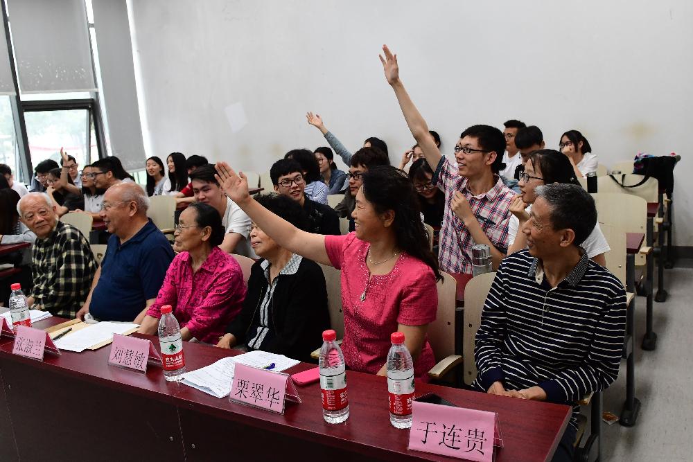 “爱国”和“求真”环节则以游戏形式展现,现场同学和老干部们分为6组共同参赛。其中“爱国”环节——巧猜歌名中,《太阳最红毛主席最亲》、《南泥湾》、《在希望的田野上》等十多首红歌回荡在教室内,声声悠扬。老干部和同学们都积极参与游戏猜歌中,熟悉悠久的曲调不仅勾起了老干部的青年回忆,也让同学们通过红歌了解到了党和国家的发展进程。