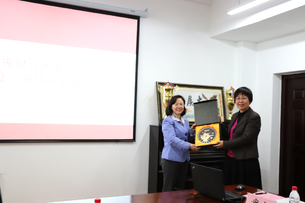 随后,党委书记葛仁霞向鸿儒金融教育基金会秘书长李秀兰女士赠送标有best365足球官网LOGO的纪念品。