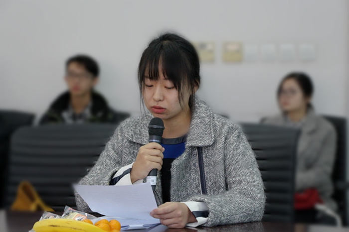 来自2015级金融学实验班的宋珺代表全体同学表达了对老师和员工导师的感谢,并分享了近几期卓越职业人才培养项目的收获,她表示大家一定会珍惜机会,主动学习,参加实践,不辜负老师和员工导师的期望。