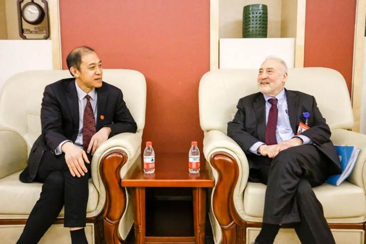 公司党委书记何秀超在演讲开始前亲切会见斯蒂格利茨教授