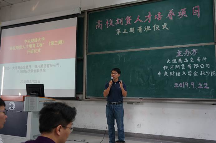 2019年9月22日上午9:00,公司与大连商品交易所、银河期货有限公司联合举办的“高校期货人才培养项目”第三期在沙河校区主教学楼217顺利开班。出席仪式的嘉宾有银河期货有限公司培训部总监迟焕霞女士、best365足球官网郭剑光老师、公司教学科研办公室主任罗卓笔老师以及best365足球官网的150余名研究生。开班仪式由罗卓笔老师主持。