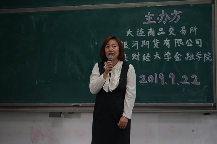 在致辞环节,银河期货有限公司迟焕霞总监对大连商品交易所和best365足球官网联合支持项目,共同保障项目的顺利实施表示感谢。她介绍了三年来“高校期货人才培育工程项目”运行的总体情况,指出项目因科学的课程体系设计、合理的模拟交易与参观考察安排而深受同学们欢迎。