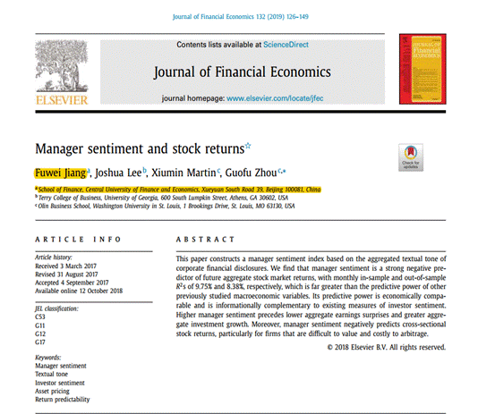 T本文发现经理人情绪会带来金融资产错误定价。公司高管或公司经理人身处公司管理的第一线,拥有大量的公司运营状况内部信息,在整个金融和经济系统里起到了重要的作用。本文发现经理人也可能对未来宏观经济或上市公司运营状况产生过于乐观或悲观的有偏预期,并创新提出了使用文本非结构化大数据提取并分析经理人情绪的新方法。还从过度外推偏误和过度自信角度给出了经理人情绪影响资产价格的行为金融微观基础。本文还发现了经理人情绪对上市公司盈余、公司投资决策、宏观经济都有显著的负面影响。