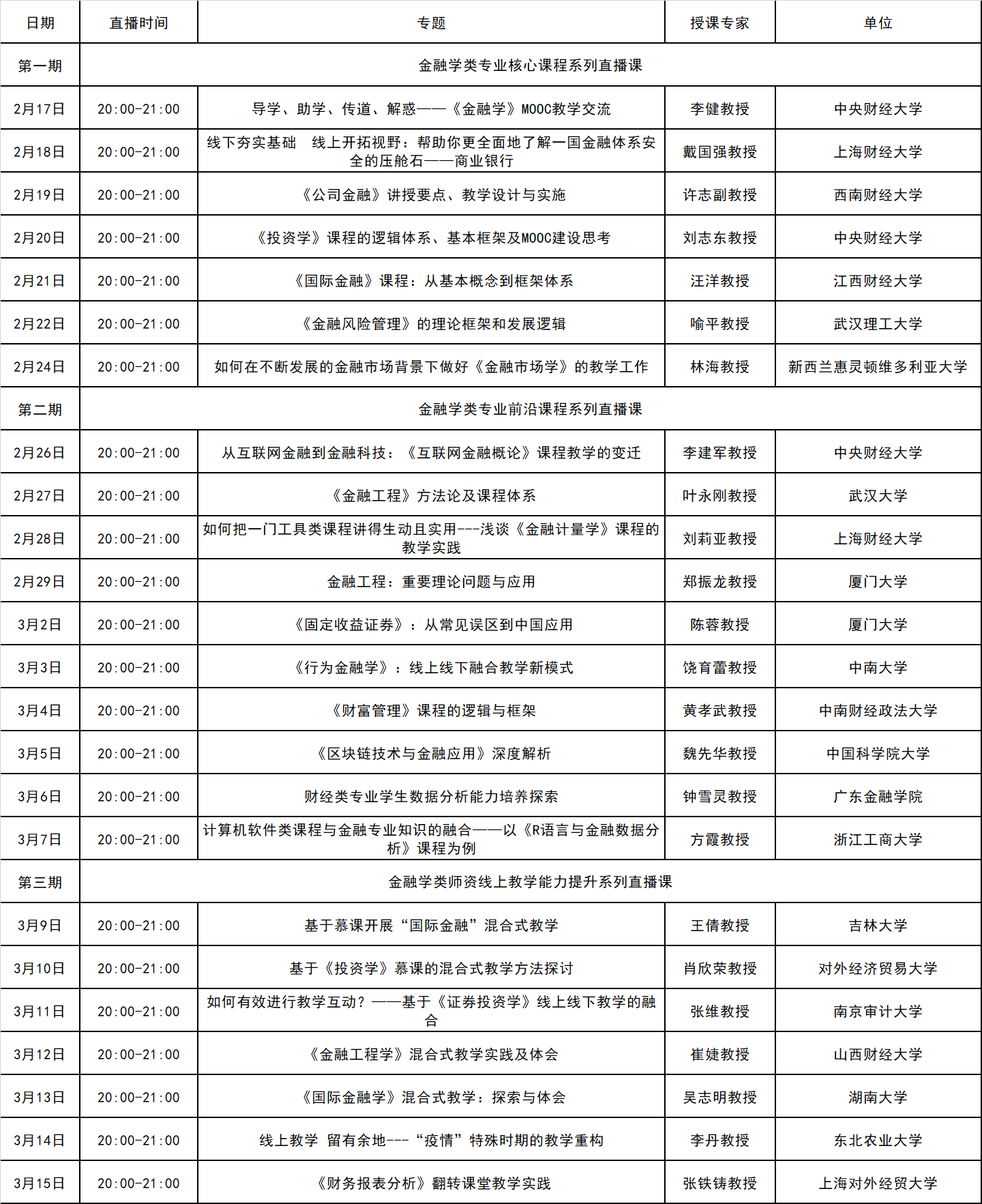 公司best365足球官网作为2018-2022年教育部高等公司金融类专业教学指导委员会秘书处单位,中国高校金融教育“金课”联盟的理事长单位,在新冠疫情导致无法正常开学授课期间,积极贯彻落实教育部《关于在疫情防控期间做好普通高等公司在线教学组织与管理工作的指导意见》的精神,联合高等教育出版社、爱课程和中国大学MOOC平台,组织策划并深入开展了全国高校“金融类专业骨干团队教学提升训练营”项目。该项目邀请了国内外金融学界教学经验丰富的知名专家学者,分三期推出了24门次专业直播课程,深入讲解学科前沿和内涵,提供基于线上课程的教学方法指导,帮助高校金融类专业教师快速有效地开展线上教学。训练营全程通过中国大学MOOC平台直播,由网易提供技术支持。