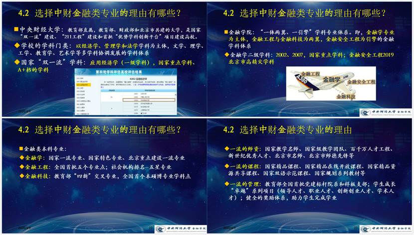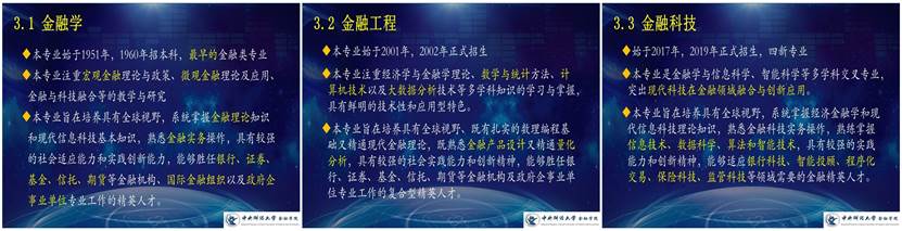 随后,他从学科优势、专业特色、团队队伍、公司产品、人才培养等方面着重介绍了选择中财金融类专业的原因。