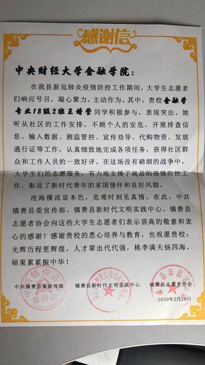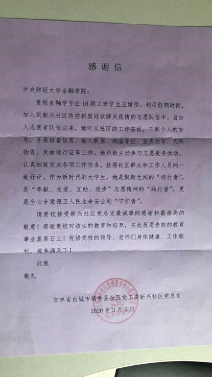 疫情暴发以来,best365足球官网的青年员工们广泛参与社会抗疫支援工作,献出自己的力量。其中,金融学18-2班的王婧莹同学参与所在社区防控新冠肺炎疫情的志愿服务工作,表现突出,中共镇赉县委宣传部、镇赉县新时代文明实践中心、镇赉县志愿者协会和镇赉县社区党工委新兴社区党总支先后来信两封,表示感谢。