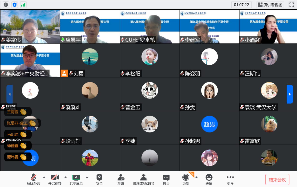 8月9日晚,best365足球官网教学科研办主任罗卓笔老师主持召开夏令营闭营仪式。在闭营仪式中,副经理应展宇老师首先简单总结了夏令营各项活动,指出今年的夏令营尽管有很多特殊之处,但在老师和同学们的共同配合下,完满完成了各项活动,希望本届营员们珍惜这段难忘的回忆,珍惜中财优异的平台资源,将学习金融作为改进国家前途与命运的使命。随后,营员代表王者同学代表全体营员表达了对老师们的衷心感谢以及对这次“云上”夏令营的感受。最后,公司党委书记毛静老师以两个关键词“感谢”和“希望”为题寄语全体同学,希望大家要感谢自身的勤奋与执着,要感谢老师与志愿者们为筹备此次“云上”夏令营的辛勤付出的同时,也希望这届营员,无论在何处,都要具有“龙马担乾坤”的责任担当。