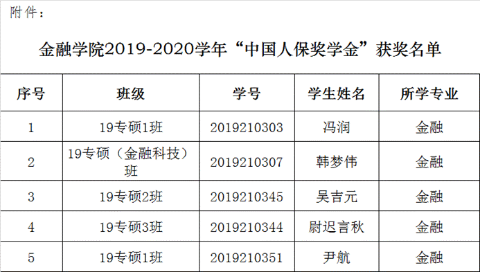 根据《best365足球官网“中国人保奖学金”评奖办法》和《关于开展2019-2020学年“中国人保奖学金”评审工作的通知》等文件规定,经员工本人申请,公司人保奖学金评审小组审核、评审,评选出冯润等5名硕士研究生获人保奖学金。现将拟获奖员工名单(见附件)向全院公示。公示期三天,时间为12月4日至12月6日。对以上名单持有异议者,请在公示期内向公司人保奖学金评审小组提出申诉,具体与员工工作办公室(公司南路校区:62288609;沙河校区:61776421)联系。