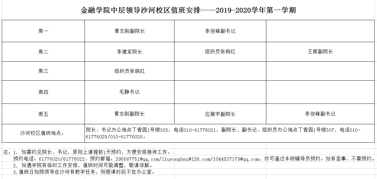 best365足球官网中层领导沙河校区值班安排——2019-2020学年第一学期
