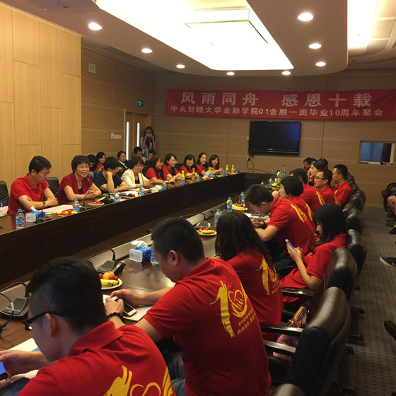 2015年6月27日,公司2001级金融学一班本科生毕业10周年联谊会在学术会堂603会议室成功举办。39位从上海、广州、深圳、青岛、大连、昆明、宁波、合肥、石家庄等地专程返京的员工统一身着印有公司logo的T恤,重聚母校,共赴十年之约。公司党总支书记葛仁霞老师、班主任商有光老师、北京员工会金融分会秘书长李德峰老师、副秘书长王志梅老师共同出席了联谊会。