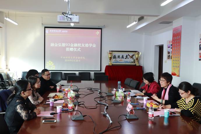 2019年3月20日上午,公司融金弘德93金融员工助学金捐赠仪式在公司南路校区主教学楼913会议室举行。公司党委书记葛仁霞、员工工作办公室主任王志梅、职业发展中心老师位锦与四位93金融员工代表欢聚一堂,追忆美好青春、倾诉对母校的情谊、再续浓浓师生情。此次捐赠仪式由王志梅老师主持。