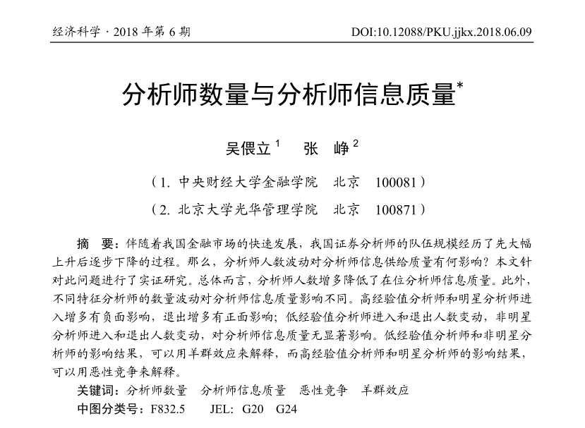 伴随着我国金融市场的快速发展,我国证券分析师的队伍规模经历了先大幅上升后逐步下降的过程。那么,分析师人数波动对分析师信息供给质量有何影响?本文针对此问题进行了实证研究。总体而言,分析师人数增多降低了在位分析师信息质量。此外,不同特征分析师的数量波动对分析师信息质量影响不同。高经验值分析师和明星分析师进入增多有负面影响,退出增多有正面影响;低经验值分析师进入和退出人数变动,非明星分析师进入和退出人数变动,对分析师信息质量无显著影响。低经验值分析师和非明星分析师的影响结果,可以用羊群效应来解释,而高经验值分析师和明星分析师的影响结果,可以用恶性竞争来解释。